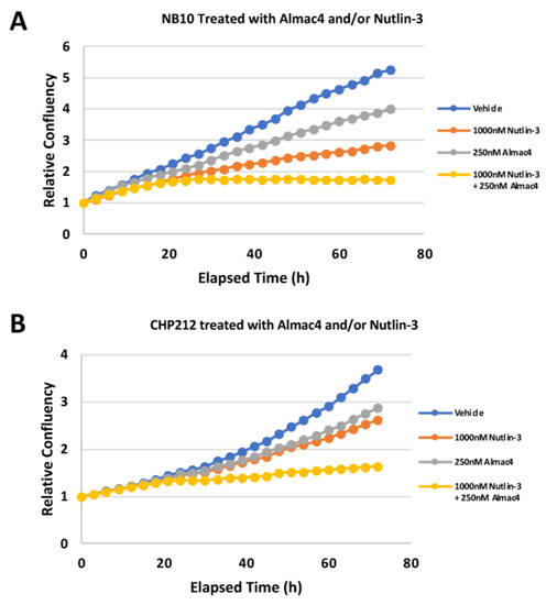 Relative efficacy of combined USP7 and MDM2 inhibition against neuroblastoma cell lines. (A,B) Relative cell confluence of NB10 (A) and CHP-212 (B) NB cells treated with DMSO, 250 nM Almac4, 1 µM Nutlin-3, or the combination of Almac4 and Nutlin-3. Cell confluence was measured using continuous live-cell imaging over 72 h of treatment.