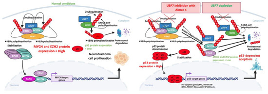 - Tavana, O.; Li, D.; Dai, C.; Lopez, G.; Banerjee, D.; Kon, N.; Chen, C.; Califano, A.; Yamashiro, D.J.; Sun, H.; et al. HAUSP deubiquitinates and stabilizes N-Myc in neuroblastoma. Nat. Med. 2016, 22, 1180–1186. [Google Scholar] [CrossRef] [PubMed]