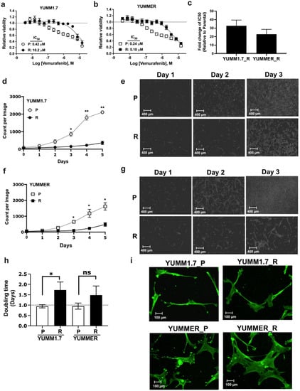 Generation of Vem–resistant YUMM lines. (a,b): Vem–sensitivity of BRAFV600E cell lines (YUMM1.7 and YUMMER) before (P) and after (R) development of resistance to Vem. Cells were treated with increasing concentrations of Vem for 72 h in DMEM medium supplemented with 10% FBS. An ATP-based assay (see Section 4) was used to calculate cell viability relative to DMSO-treated cells. (c): Calculated fold-change in IC50 of Vem of resistant lines relative to parental cells. Data are mean ± SEM of five independent experiments. (d–g): Parental and resistant YUMM cells were cultured on a 24-well plate in medium with 10% FBS, and proliferation was tracked using the IncuCyte instrument phase module. (d,f): Cell count was determined using phase-object image analysis. (e,g): images captured using the 10× IncuCyte’s objective. (h): Doubling time was calculated using incuCyte data (see Section 4). Results are the mean ± SEM of three independent experiments. (i): Morphology of parental and resistant cells, immune-stained, fixed melanoma cells with vimentin antibody. ns, nonsignificant * p < 0.05; ** p < 0.01.
