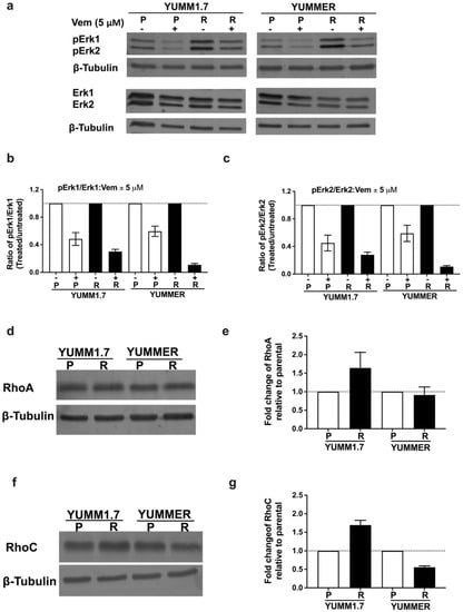 Vem–resistance is independent of MAPK pathway reactivation but is associated with upregulation of Rho proteins. (a): Western blot analysis of phosphorylated Erk proteins (pErk1/2) YUMM in cells treated for 48 h with 5 µM Vem or DMSO (−). (b,c): Quantification of pERK/ERK: the ability of 5 mM Vem to inhibit MAPK activity was assessed from the ratio of band densities for p-Erk1/2 vs. Erk1/2. Resistant lines showed similar or greater Vem–mediated inhibition of MAPK activity than parental cells. Results represent mean ± SEM from three independent experiments. (d–g): Expression of Rho A and Rho C proteins was assessed by immunoblotting whole cell lysates (30 µg total protein) with values normalized to β-tubulin. The quantified results (e,g) represent the mean ± SEM of four independent experiments.