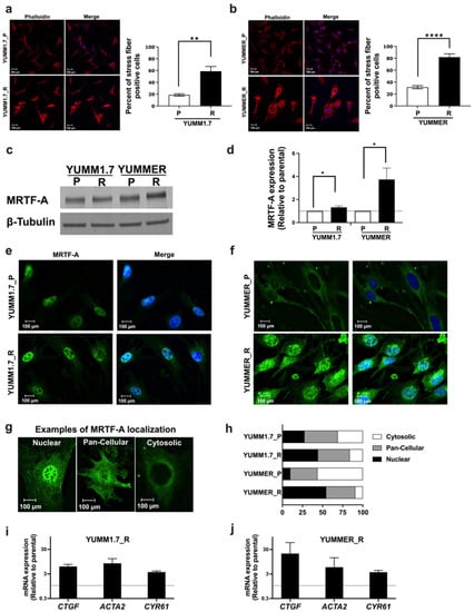 Since activation of Rho GTPases and downstream transcription factor signaling through MRTF or YAP is a common mechanism for melanoma resistance without MAPK-reactivation; therefore, we asked if Rho signaling was increased in our resistant mouse lines. First, we measured expression of RhoA family members (Figure 2d–g and Supplementary Figure S1c,d). YUMM1.7_R had modest increases in RhoA (64%) and RhoC (69%), while the YUMMER_R line showed small decreases in Rho protein levels: RhoA (10%) and RhoC (44.3%). As a measure of a downstream Rho mechanism, we assessed actin stress fiber staining with rhodamine-phalloidin. Stress fibers were defined as cells with at least one wide phalloidin-stained fiber spanning more than 90% of the entire cell area. Cortical F-actin was not considered to be related to Rho signaling (Supplementary Figure S2). The fraction of cells positive for actin stress fibers was significantly increased in resistant lines vs. the parental lines (YUMM1.7: 18.7 ± 4.2% for P, 58.7 ± 18.1% for R; YUMMER: 31.4 ± 5.9% for P, 81.8 ± 12.6% for R, Figure 3a,b).