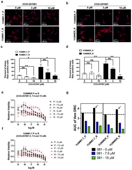 We sought to determine whether activation of the MRTF pathway contributes to Vem–resistance. Using CCG-257081, an MRTF-pathway inhibitor (MRTFi) acting downstream of ROCK [,] we tested effects of the compound on measures of Rho/MRTF signaling and cell sensitivity to Vem. Treating YUMM1.7_R and YUMMER_R with 10 µM of CCG-257081 for 24 h significantly reduced actin-stress fibers (Figure 4a–d). CCG-257081 (10 µM) also significantly reduced stress fibers in the parental YUMM1.7_P cells, but not in the YUMMER_P cells.