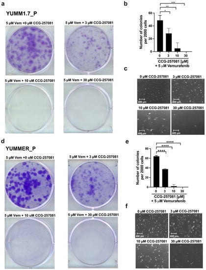 Exponentially growing YUMM1.7_P and YUMMER_P cells were harvested. About 2000 cells were plated into a 6-well plate and left to adhere overnight. On the next day, drug treatment was applied (5 µM Vem ± 3 µM or 10 µM of CCG-25081). Plates were monitored until Vem–treated cells formed sufficiently large colonies (about 50 cells per colony), which took about 15 days. Colonies were washed in PBS and stained with a fixation-staining solution containing 3.7% formaldehyde and 0.5% crystal for 30–60 min. Plates were scanned, and ImageJ software (version: 2.14.0/1.54f) was used to count colonies depending on mean area quantification.