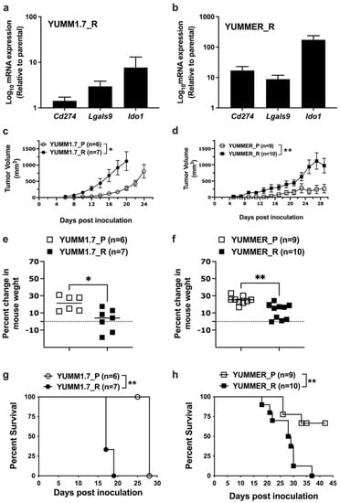 Vem resistance upregulates gene expression of ICIs and enhances the growth of YUMM tumors in vivo. (a,b): mRNA levels of ICIs (Cd274, Lgals9, and Ido1) in YUMM1.7_R and YUMMER_R cells relative to the corresponding parental line. The mRNA levels were normalized to the reference gene Tbp, and fold-change was calculated relative to the corresponding parental line. (c,d): Tumor growth in male C57BL/6 mice injected subcutaneously with 1 × 106 of YUMM1.7_P or YUMM1.7_R (a) and YUMMER_P or YUMMER_R (b). Tumor growth was monitored every two days throughout the entire course of the experiment and mice were sacrificed at the approved humane endpoint. (e,f): Change of body weight of mice at endpoint relative to the weight before cell injection. (g,h): Percentage of surviving mice. The survival curve endpoints were body weight loss (<10%), tumor ulceration, or difficulty ambulating. A 2-way ANOVA was used for the tumor size, log-rank test for survival curves, and t-test for body weight changes. * p < 0.05; ** p < 0.01.