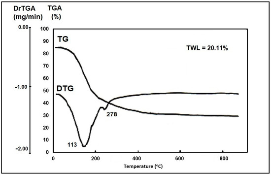 Thermal analysis (TG–DTG) performed in the temperature range 20–1000 °C showed a total mass loss of 20.11%. According to the TG curve the most significant mass loss take place in the temperature range from 20 to 300 °C that may be assigned to the loss of water molecules [17,25]. This interpretation of results is supported by the presence of two endothermic peaks on the DTG curve; one peak at 113 °C attributed to water adsorbed in the pores (physically adsorbed water) and the other one at 278 °C attributed to desorption of structural water (hydrated water removal) [44]. After that, a continuous slight mass loss is observed up to 900 °C. This mass loss can be attributed to the decomposition reaction of precursor and formation of Na2TiSiO5.