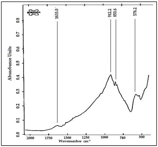 The FTIR spectrum recorded in the range of 400–2000 cm−1 (Figure 3) for the Na2TiSiO5 nanopowder is in correlation with literature data [17,30]. The major absorption bands correspond to the asymmetric and symmetric stretching vibrations (at 850.6 cm−1 assigned to the asymmetric stretching of Ti–O–Ti bridges, at 912.2 cm−1 assigned to the asymmetric stretching of Si–O–Ti bridges and at 576.2 cm−1 assigned to the asymmetric stretching of Si–O–Si bridges [17,19,30,31].