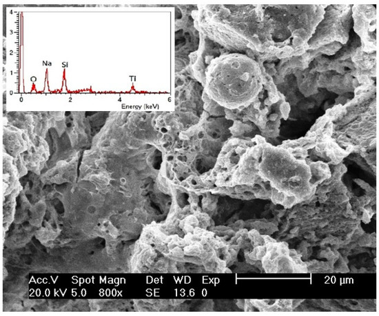 Surface morphology, texture, and particles size of Na2TiSiO5 nanopowder have been investigated by SEM and TEM [25,32]. The Figure 4 presents the SEM micrograph with EDX spectra insert for of the synthesized Na2TiSiO5. The EDX analysis qualitatively confirmed the purity of the Na2TiSiO5 powder.