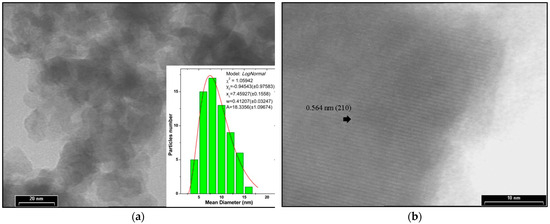 The morphology and mean diameter have been studied using a bright-field (BF) TEM micrograph (Figure 5a). In the HRTEM image of the synthetized Na2TiSiO5 are inserted the histogram of Feret diameter. The particle’s diameters have been evaluated using the mean value of distances between the pairs of parallel tangents to the projected outline of the particle (Feret’s diameter). The mean diameter has been calculated assuming a lognormal distribution of experimental data [25,32].