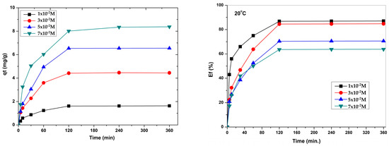 The adsorption’s kinetics process describes the degree of metal ions removal, and it is one of the most important characteristics of the adsorption process efficiency. Generally, the sorption of metal ions increases with the increase of the contact time. The sorption reactions take place with an important rate in the initial phases and are gradually slowed down until the equilibrium state is reached [8,13,18].