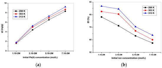 The physical–chemical parameters that influence the adsorption capacity and retention efficiency of PB(II) ions on Na2TiSiO5 are contact time, pH, initial concentration of Pb(II) ions and temperature. Figure 6 presents the influence of the contact time and the initial ion concentration of Pb(II) on the adsorption capacity and retention efficiency of Pb(II) ions at different temperatures.