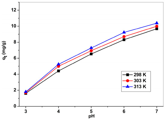 As shown in Figure 7, the adsorption capacity of Pb(II) on Na2TiSiO5 has a continuous growth with the increase in pH values in the range of 4–7. The modification of pH influences the Pb(II) ions distribution and the adsorbent site’s protonation/deprotonation on the adsorbent’s surface. At the acidic pH, the electrostatic repulsion prevents the effective adsorption of ions due to the protonated surface of the Na2TiSiO5 adsorbent and positive charge of Pb(II) ions [33,38]. As the pH gradually attains 7.0, the Na2TiSiO5 adsorbent tends to have negative charges on the surface, due to the superficial deprotonation, which leads to more accessible active sites on the Na2TiSiO5 particles’ surface. Therefore, the electrostatic attraction of Pb(II) ions and negatively-charged superficial active sites leads to a higher and more convenient adsorption and uptake of Pb(II) ions [38].