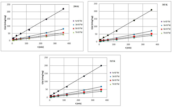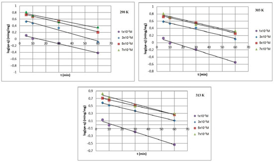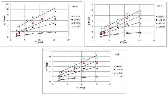 Figure 8, Figure 9 and Figure 10 present the plots of the linearized form of the PF-order model, PS-order model, IPD model, Elovich model, and Bangham model for all studied initial ion concentrations. To calculate the kinetics parameters (q1, k1, q2, k2, ki, and I), the slopes and intercepts of the plot of log(qe − q) vs. t, t/qt vs. t, and qt vs. t1/2 have been used.