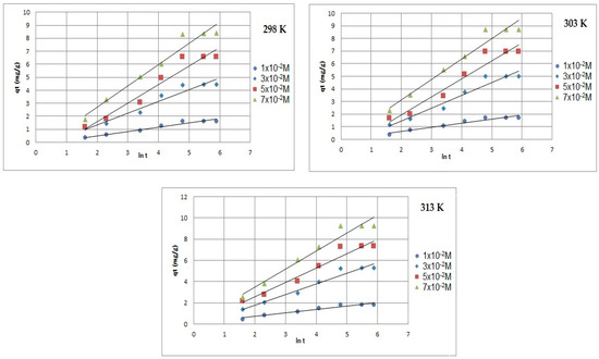 where α represents the rate of chemisorption at zero coverage (mg/g min) and β represents the desorption rate constant (g/mg). These constants have been calculated having in view the slope and the intercept of the qt vs. lnt plots.