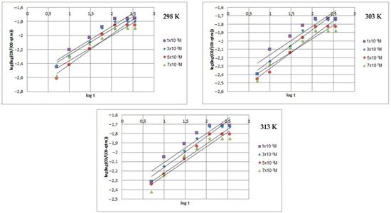 Bangham model is needed to check if pore diffusion is the only rate-controlling step in the adsorption system using the kinetic data [49]. This model can be expressed as Equation (5).