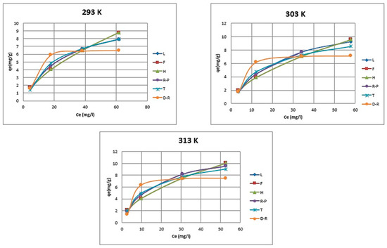 Adsorption Isotherms for different temperatures. (L—Langmuir isotherm, F—Freundlich isotherm, H—Halsey, R-P—Redlich–Paterson, T—Temkin, D-R—Dubinin—Kaganer–Radushkevich).