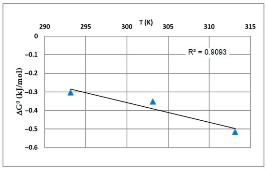 To conclude whether the adsorption process is spontaneous or not it is necessary to consider the process’s thermodynamic characteristics. Gibb’s free energy change (ΔG°) is the fundamental criterion of reaction’s spontaneity; if ΔG° has a negative value at a given temperature then the reaction take place spontaneously [12,48]. The thermodynamic parameters for the adsorption process (Gibb’s free energy change (ΔG°), enthalpy change (ΔH°), and entropy change (ΔS°)) is given by the Equations (13) and (14) [48,49,50]: