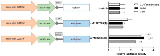 2.1. The Risk Allele (T) of rs71327024 Decreases the CXCR6 Promoter Activity in Jurkat, CEM and CD4+ Primary Cells