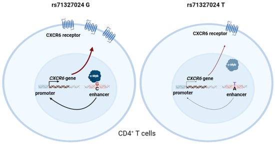 Uvarova, A.N.; Stasevich, E.M.; Ustiugova, A.S.; Mitkin, N.A.; Zheremyan, E.A.; Sheetikov, S.A.; Zornikova, K.V.; Bogolyubova, A.V.; Rubtsov, M.A.; Kulakovskiy, I.V.; et al. rs71327024 Associated with COVID-19 Hospitalization Reduces CXCR6 Promoter Activity in Human CD4+ T Cells via Disruption of c-Myb Binding. Int. J. Mol. Sci. 2023, 24, 13790. https://doi.org/10.3390/ijms241813790