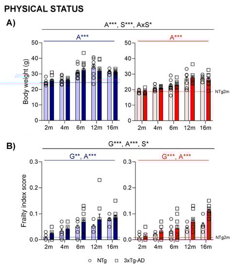 - Giménez-Llort, L.; Arranz, L.; Maté, I.; De La Fuente, M. Gender-Specific Neuroimmunoendocrine Aging in a Triple-Transgenic 3×Tg-AD Mouse Model for Alzheimer’s Disease and Its Relation with Longevity. Neuroimmunomodulation 2008, 15, 331–343. [Google Scholar] [CrossRef]