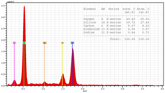 The high degree of Z coating with modifier 4 was also confirmed by the EDX analysis (Figure 5 and Figure 6). The increased carbon (31 wt.% vs. 5 wt.%) and nitrogen (11 wt.% vs. 0 wt.%) content, and the practical absence of aluminum and sodium on the Z4 surface, indicate that the zeolite surface in the studied area was covered with a layer of 4.