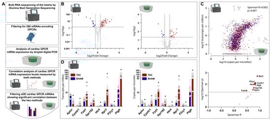 2.2. Bulk RNA Sequencing Identified 69, and ddPCR Identified 27 Cardiac GPCR Genes to Be Differentially Expressed in TAC vs. SHAM Rat Hearts