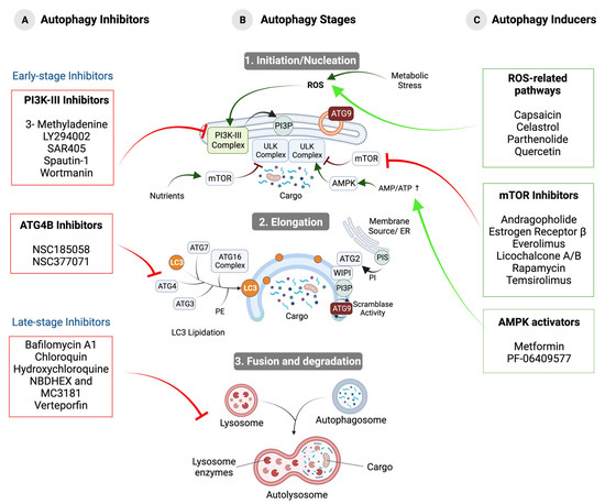 Stages of autophagy and the effect of modulating compounds on the progression of this process. (A) Autophagy inhibitors. Early-stage inhibitors that affect autophagosome formation and inhibit PI3K-III and ATG4B and late-stage inhibitors that affect lysosomal function by interfering with autophagosome–lysosome fusion or cargo degradation are shown. (B) Stages of autophagy. (1) Initiation/nucleation: under stress conditions, IM synthesis is initiated around the cargo by the recruitment and activation of ULK Complex, PI3K-III Complex, and ATG9 vesicles. (2) Elongation: expansion of the IM by membrane lipid addition driven by the ATG2–WIPI complex, ATG9, and LC3 lipidation. (3) Fusion and degradation: fusion between the autophagosome and the lysosome to form the autolysosome and subsequent degradation of the cargo. (C) Autophagy-inducing compounds. Modulators acting through ROS-related pathways, mTORC1 inhibitors, and AMPK activators are shown.