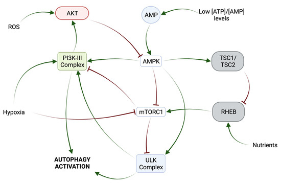 mTORC1 (mammalian Target of Rapamycin Complex 1) has been described as a key autophagy regulator. It is usually active in situations where the energy level is high, when growth factors are present, or when glucose and amino acids are prevalent [24]. Then, mTORC1 phosphorylates and inactivates the ULK Complex and VPS34 (Beclin1-VPS34-ATG14/UVRAG) Complexes (Figure 2) [25]. Under stress conditions, when the amino acid or ATP concentration decreases, AMPK (Adenine Monophosphate-activated Protein Kinase) is activated by a variety of mechanisms, including LKB1 (Liver Kinase B1)-mediated phosphorylation and the binding of the allosteric effector AMP [26]. Once activated, AMPK negatively regulates mTORC1 through several molecular mechanisms (Figure 2). On one hand, it phosphorylates and activates the tumor suppressor proteins TSC2/TSC1 (Tuberous–Sclerosis Complex 1/2) (Figure 2). On the other hand, AMPK inhibits the activity of RHEB (Ras Homolog Enriched in Brain), which is required for mTORC1 activity (Figure 2) [27]. In addition, AMPK negatively regulates the activity of the mTORC1 subunit RAPTOR (Regulatory-Associated Protein of mTOR) [26]. In addition, AMPK positively regulates the ULK1/2 Complex through phosphorylation and promotes the activation of PI3K-III by phosphorylating Beclin1 [25,28].