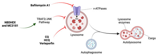 Chloroquine (CQ) and hydroxychloroquine (HCQ) deacidify and block the fusion of autophagosomes with lysosomes (Figure 5) [50]. However, they can interfere with other critical biological processes. Different authors have suggested that their anticancer effects are independent of autophagy, simply by triggering lysosomal lysis and cell death (Table 3) [64].
