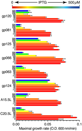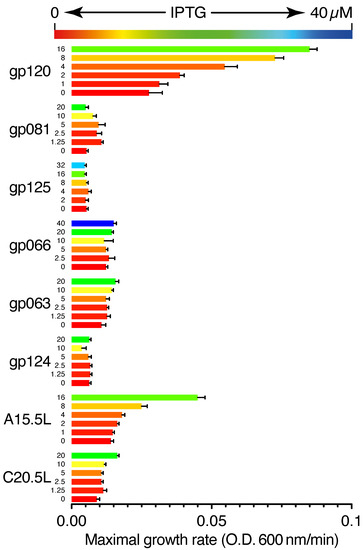 Figure 1 shows the growth rates of bacteria expressing the different aforementioned viral proteins. The growth was measured as a function of OD600nm with respect to time, from which a maximal growth rate was determined. Upon increasing the concentration of the IPTG inducer, a corresponding reduction in growth rate is observed for the bacteria that express most chimeras, albeit at different levels. Specifically, at 60 µM IPTG, bacteria that express gp120, C20.5L, gp081, A15.5L, gp063, gp125, gp066, and gp124, exhibited a relative growth reduction of: 31%, 38%, 42%, 54%, 75%, 77%, 97%, and 103%, respectively.