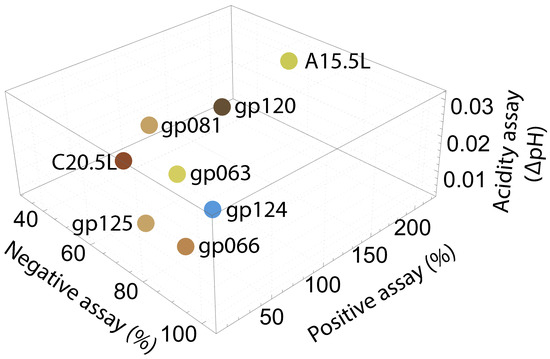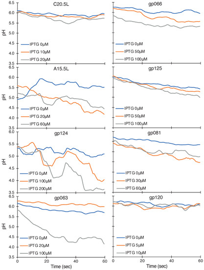 Figure 3 shows the pattern of pH change in the bacterial cells upon expression of different proteins. Bacteria that express the gp124, A15.5L, gp063, gp125, gp081, and gp066 chimera exhibit a pronounced pH drop indicative of their conductivity, while those expressing C20.5L and gp120 do not. The slopes of the linear regressions of the data are listed in Figure 4. Here, it is worth mentioning that the concentration of IPTG chosen for the different proteins was not uniform. We only studied the maximal pH influx for a particular channel. Furthermore, another intermediate concentration of IPTG was selected to show an increment of pH influx upon increasing IPTG concentration.