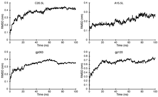 Backbone RMSD plots as a function of time for the molecular dynamics simulation of proteins: C20.5L, A15.5L, gp063, and gp120 within a pre-equilibrated 1,2-dipalmitoyl-sn-glycero-3-phosphocholine bilayer.