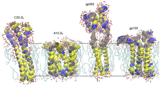 One hundred (100) ns MD simulated overlayed ensemble structures of C20.5L, A15.5L, gp063, and gp120 embedded within a triphasic lipid bilayer. Rough bilayer boundaries are shown in dotted lines with lipid and water molecules within 3 Å vicinity of proteins.
