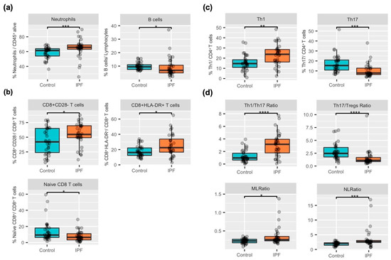 Characterization of the innate and adaptive compartment in IPF patients (orange box) and controls (blue box) (median [IQR]) (a) Comparison of % neutrophils and B lymphocytes. (b) Comparison of % CD8+CD28−, HLADR+, and naive CD8+ T cells from CD8+ pool. (c) Comparison of % Th1 and Th17 from CD4+ pool. (d) Comparison of Th1/Th17, Th17/Tregs, Neutrophil-to-lymphocyte (NRL), and Monocyte-to-lymphocyte (MLR) ratios. * p < 0.05, ** p < 0.01, *** p < 0.001 and **** p < 0.0001.