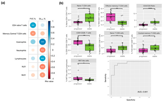 (a) Significant Spearman correlations between blood immune populations/ratios and lung function at recruitment in IPF patients. * p < 0.05, ** p < 0.01 and **** p < 0.0001. (b) Differential distribution of the baseline immune population in IPF progressors (pink box) and stable (green box); (median [IQR]): Comparison of % NKT-like cells; CD8+CD28− from CD8+ pool, different CD8+ and CD4+ T memory cells and CD4/CD8 ratio; Receiving Operating Characteristics (ROC) curve of the Elastic Net multivariate analysis identifying the immune cell populations associated with disease progression.