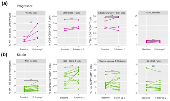 To assess the stability and reproducibility of the immune differences observed at baseline between stable and progressors, we determined the immune profile again in alive patients (stable or progressor) during 18 to 60 months of follow-up. Figure 4a,b presents the paired analysis between the baseline and the long term assessment, and shows that the populations included in the machine learning classification model, CD8+CD28−, memory effector CD4+ T cells, CD4/CD8 ratio, and NKT-like cells, were stable in the long-term.
