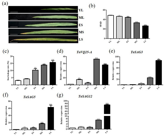 Expression profiles of TaVQ25-A in wheat flag leaves at different developmental stages. (a) Five developmental stages of wheat flag leaves. YL: young leaves; ML: mature and fully expanded leaves; ES: early senescent leaves with <10% leaf area yellowing; MS: middle senescent leaves with leaf area yellowing between ES and LS; LS: late senescent leaves with >50% leaf area yellowing (scale bar: 5 cm). (b) Chlorophyll content of leaves in (a) was measured by SPAD502 Plus Chlorophyll Meter. (c) Ion leakage rate of wheat flag leaves in (a). (d) Expression level of TaVQ25-A at five developmental stages of wheat flag leaves. (e,f) Expression of the senescence up-regulated marker genes TaSAG3 (e), TaSAG5 (f), and TaSAG12 (g) in wild-type leaves at five developmental stages. Data and error bars represent means ± SE. Student’s t-test, * p < 0.05, ** p < 0.01, *** p < 0.001, and n ≥ 15. All of the experiments have been repeated at least three times independently.