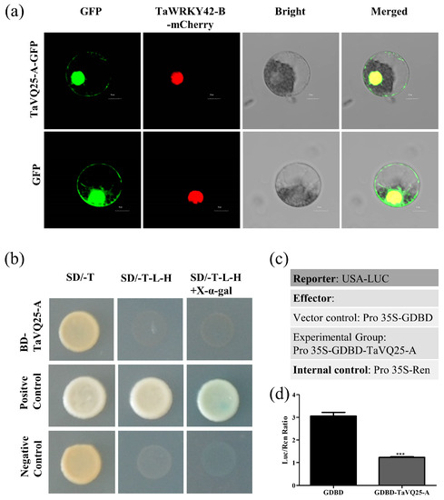 Furthermore, the GAL4 yeast expression system was used to detect the transcriptional activation activity of TaVQ25-A. The yeast strain AH109 was transformed with the construct pGBTK7-TaVQ25-A, pGBTK7 was used as a negative control, and pGBTK7-TaNAC6 was used as a positive control. TaVQ25-A exhibited no transcriptional activity in yeast (Figure 2b). We also used the luciferase reporter system to explore the transcriptional activity of TaVQ25-A in wheat protoplasts. TaVQ25-A was fused to a Gal4 DNA-binding domain (GDBD) and co-transfected with the firefly luciferase (LUC) gene, and the Renilla luciferase (REN) gene, driven by the CaMV 35S promoter fusion was used as an internal control (Figure 2c). The data indicates that TaVQ25-A did not possess transcriptional activity (Figure 2d). These results suggest that TaVQ25-A is localized in the nuclei and cytoplasm and has no transcriptional activation activity.