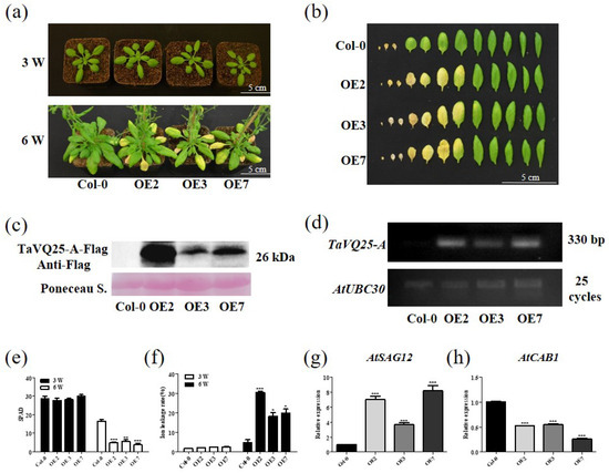 To further assess the role of TaVQ25-A in leaf senescence, we produced TaVQ25-A-overexpressing (OE) lines in Arabidopsis. First, we generated a construct in which the fusion of the full-length TaVQ25-A coding sequence (CDS) and 3 × Flag tags was driven by the CaMV 35S promoter. Three independent homozygous transgenic Arabidopsis lines (OE2, OE3, and OE7) were selected for phenotypic and physiological analyses. We observed that 6-week-old OE2, OE3, and OE7 plants showed a precocious leaf senescence phenotype compared to the wild-type (WT) Col-0, but 3-week-old TaVQ25-A-OE lines showed no obvious difference from Col-0 (Figure 3a). The rosette leaves were harvested from age-matched Col-0 and TaVQ25-A-OE lines. The leaves of the TaVQ25-A-OE plants were senesced earlier than Col-0 (Figure 3b). The elevated expression level of TaVQ25-A was confirmed using RT-PCR and Western blot in TaVQ25-A-OE lines (Figure 3c,d). Consistently, the chlorophyll content in the TaVQ25-A-OE lines was lower than that in Col-0, and the ion leakage rate was accelerated by TaVQ25-A overexpression (Figure 3e,f). Consistent with the observed phenotypic alterations, the senescence-associated gene (SAG) AtSAG12 was upregulated in TaVQ25-A-OE plants, while the senescence-downregulated gene (SDG) AtCAB1 was suppressed in TaVQ25-A-OE plants (Figure 3g,h). Therefore, these results suggest that TaVQ25-A positively regulates the age-triggered leaf senescence process.