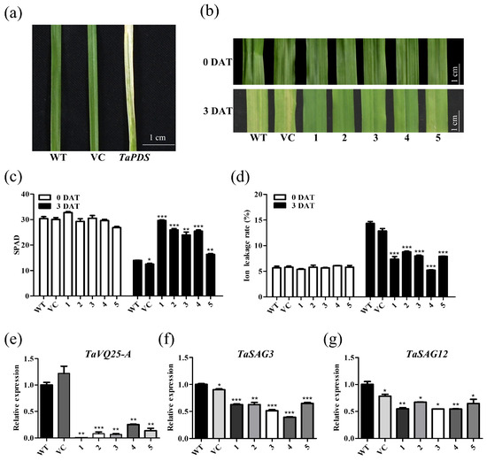 TaVQ25-A-silenced wheat plants retard the progression of dark-induced leaf senescence. (a) Phenotype of virus-induced gene silencing of TaPDS in wheat. (b) Phenotype changes in the sixth leaf in plants treated with water in the dark. WT: plants infection buffer without BSMV; VC: vector control, plants inoculated with the empty BSMV viral vector; 1–5: plants were inoculated with BSMV targeted to TaVQ25-A-silenced wheat plants. DAT: days after treatment. (c,d) Chlorophyll content (c) and ion leakage rate (d) before and after treatment. (e) The qRT-PCR profiles of TaVQ25-A in mock (WT and VC) and knockdown lines (1–5). (f,g) The expressions of the wheat senescence up-regulated genes TaSAG3 (f) and TaSAG12 (g) in TaVQ25-A-silenced wheat plants. Data and error bars represent means ± SE. Student’s t-test, * p < 0.05, ** p < 0.01, *** p < 0.001, and n ≥ 20. All of the experiments have been repeated at least three times independently.