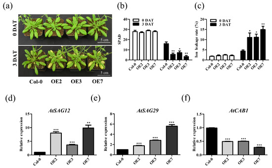 Overexpression of TaVQ25-A promotes dark-induced leaf senescence. (a) Phenotype of 4-week-old Col-0 and TaVQ25-A-OE plants were treated with darkness for 3 days. (b,c) Chlorophyll content (b) and ion leakage rate (c) of leaves from 4-week-old transgenic plants as well as Col-0 before and after dark treatment. (d–f) Relative expression levels of senescence marker genes in (a). Data and error bars represent means ± SE. Student’s t-test, * p < 0.05, ** p < 0.01, *** p < 0.001, and n ≥ 20. All of the experiments have been repeated at least three times independently.