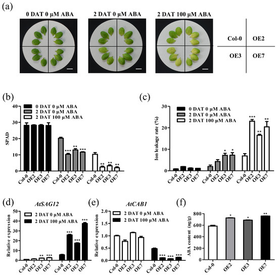 In addition, we treated the non-senescent fifth or sixth rosette leaves of 4-week-old TaVQ25-A-OE and Col-0 plants with 100 μM ABA for 2 d. ABA-induced leaf senescence appeared in both TaVQ25-A-OE and Col-0 plants (Figure 7a), but lower chlorophyll content and more severe ion leakage rates were found only in the TaVQ25-A-OE plants (Figure 7b,c). The transcription data for AtSAG12 and AtCAB1 coincided with the phenotypic changes between TaVQ25-A-OE and Col-0 plants (Figure 7d,e). To further clarify the effects of TaVQ25-A on ABA biosynthesis, we quantified the ABA content in the leaves of TaVQ25-A-OE plants and Col-0. Using enzyme-linked immunosorbent assay, we found that ABA content was elevated in the leaves of TaVQ25-A-OE lines when compared with that in Col-0. These findings strongly support our hypothesis that TaVQ25-A is involved in the regulation of leaf senescence via the ABA pathway.