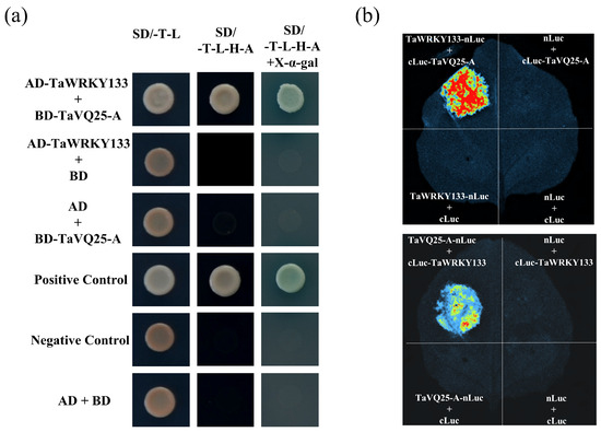 The CDS of TaVQ25-A was added to pGBKT7 to generate BD-TaVQ25-A. The CDS of TaWRKY133 was added to the pGADT7 vector to generate AD-TaWRKY133. The recombinant vectors were transformed into the AH109 yeast strain. Empty plasmids were used as controls. The growth of transformed yeast cells on SD/-T-L (SD/-Trp-Leu) and SD/T-L-H-A (SD/-Trp/-Leu/-His/-Ade) media was used to reflect the strength of the protein–protein interaction.