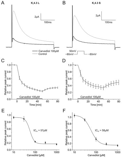 Effects of carvedilol (100 µM) on currents produced by the Kv4.3 isoform. (A,B) Representative current traces of Kv4.3 L (A) and Kv4.3 S (B) prior to (gray) and after (black) carvedilol application (50 min). (C,D) Relative peak current of Kv4.3 L (n = 8) (C) and Kv4.3 S (n = 8) (D) before, during and after the application 100 µM carvedilol. (E,F) Concentration-response curves for Kv4.3 L (n = 8–12) (IC50 = 57.1 ± 12.6 µM) (E) and Kv4.3 S (n = 8–13) (IC50 = 58.2 ± 6.2 µM) (F).