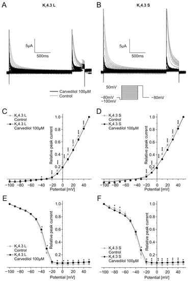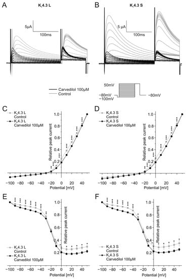 The current peak evoked by the second voltage step reflects channel inactivation. Inactivation of the two Kv4.3 isoforms was analyzed by plotting the peak current during the second step of the voltage protocol against the respective test pulse potential. Half-maximal inactivation voltages after application of 100 µM carvedilol were numerically more positive compared to control conditions without reaching statistical significance. Kv4.3 L half-maximal inactivation voltage was −39.5 ± 1.3 mV under control conditions and −38.3 ± 1.3 mV after incubation with carvedilol (n = 11, p = 0.016), whereas values obtained with Kv4.3 S yielded −40.2 ± 2.1 mV under control conditions and −39.5 ± 1.6 mV after carvedilol administration (n = 11, p = 0.398) (Figure 2E,F).