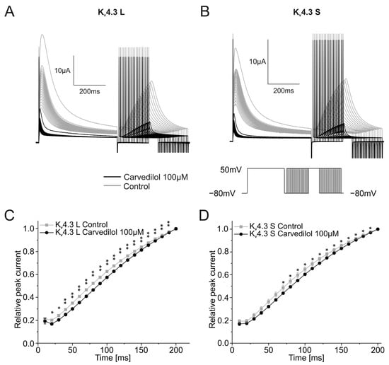 Effects of carvedilol (100 µM) on the recovery from inactivation of the two Kv4.3 isoforms. (A,B) Representative Kv4.3 L (A) and Kv4.3 S (B) current traces of induced by the indicated voltage protocol prior to (gray) and after (black) carvedilol application (50 min). (C,D) Recovery from inactivation curves were calculated by plotting peak current amplitudes against the duration of the preceding repolarizing step for Kv4.3 L (C) and Kv4.3 S (D) (n = 10). * p < 0.05, ** p < 0.01.