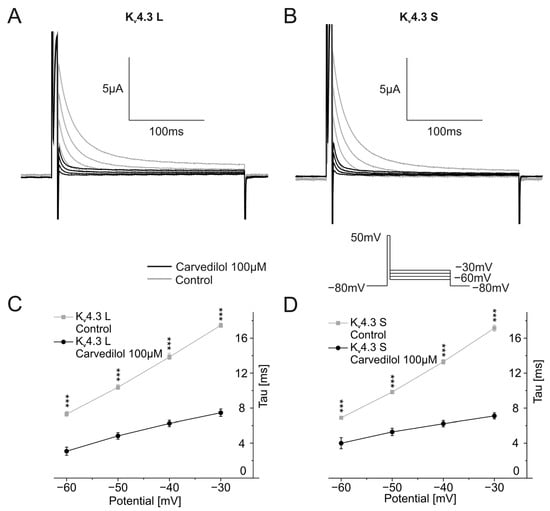 Effects of carvedilol (100 µM) on deactivation of Kv4.3 isoforms. (A,B) Representative current traces of Kv4.3 L (A) and Kv4.3 S (B) induced by indicated voltage protocol prior to (gray) and after (black carvedilol application (50 min)). (C,D) Deactivation time constants for Kv4.3 L (C) and Kv4.3 S (D) (n = 11). *** p < 0.001.