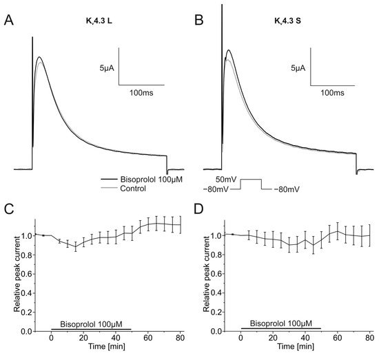 The impact of the bisoprolol on currents carried by Kv4.3 isoforms was analyzed as described earlier using a single step depolarizing voltage protocol. Example traces are depicted in Figure 6A,B. Bisoprolol neither affected Kv4.3 L nor Kv4.3 S current amplitudes (Figure 6A,B). Peak currents did not change significantly during the 50 min wash-in compared to control measurements for Kv4.3 L (102.3 ± 7.5%, n = 11, p = 0.765) or Kv4.3 S (95.3 ± 8.7%, n = 9, p = 0.607) (Figure 6C,D).