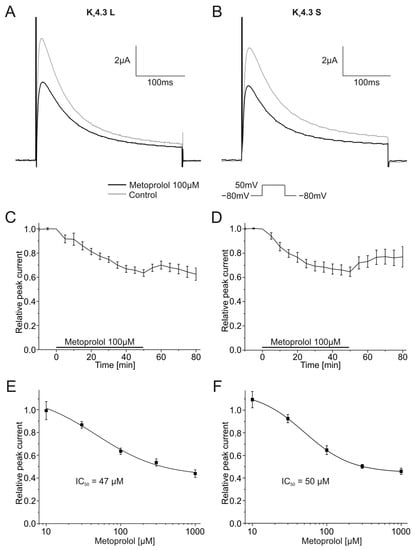 Pharmacological effects of 100 µM metoprolol on both Kv4.3 isoforms were similarly assessed. Kv4.3 L currents were blocked 36.5 ± 2.8% (n = 9, p < 0.001), and Kv4.3 S 35.3 ± 3.9% (n = 9, p < 0.001) during metoprolol application (Figure 7A,B). The degree of current block did not differ between isoforms. Inhibitory effects of metoprolol on Kv4.3 S appeared to be partially but not significantly reversible; mean peak Kv4.3 S current normalized to control conditions recovered during 30 min wash-out from 64.7 ± 3.9% in the presence of metoprolol to 76.9 ± 8.5% (n = 9) (Figure 7D). No apparent recovery was observed among Kv4.3 L channels (63.5 ± 2.8% versus 62.5 ± 5.1% after wash out, n = 9) (Figure 7C). IC50 values for metoprolol blockade yielded 47.3 ± 34.2 µM (n = 9–11) for Kv4.3 L and 49.8 ± 0.7 µM for Kv4.3 S (n = 9–11), respectively (Figure 7E,F).