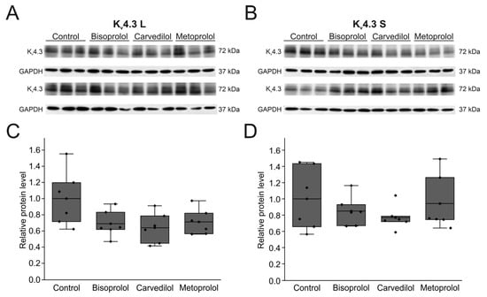 Effects of betablockers on Kv4.3 isoform expression in HEK-293T cells. (A) Representative Western blots after transfection with Kv4.3 L (A) or Kv4.3 S (B) before and after incubation with respective betablockers (100 µM) for 24 h (n = 6 each). (C,D) Protein quantification of Kv4.3 L (C) and Kv4.3 S (D) protein relative to respective controls and normalized to GAPDH.