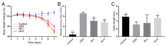 At the beginning of the DSS treatment, there were no obvious differences in body weight among all the groups (Figure 1). After 1 week of DSS treatment, the body weights of the mice in the DSS group were dramatically reduced to approximately 85.44% of their initial body weights compared to the healthy mice (p < 0.01). The inosine intervention effectively suppressed the DSS-induced body weight loss, especially in the IN-H group (which presented with approximately 89.78% of their initial body weights). The DAI score was extensively applied to evaluate the severity and development of colitis. Compared with the mice in the NC group, the DSS treatment dramatically elevated the DAI score (p < 0.001). Interestingly, the inosine interventions at 100 mg/kg and 800 mg/kg significantly suppressed the increases in the DAI scores (p < 0.01). There was a remarkable decrease in the colon length after the DSS treatment (p < 0.01). A high dose of inosine intervention remarkably reduced the effects on the DSS treatment (p < 0.01). These results exhibit that inosine may have the potential to improve colitis.